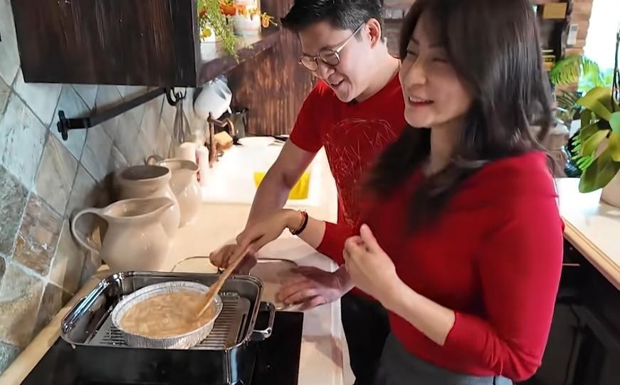 整段影像里,郭晶晶是灶台前的主理人,掌勺、切配、调浆一气呵成;霍启刚则更多以“观察者+讲述者”的姿态穿插其间,偶尔递个碗、搅个粉,却始终未越位主导。